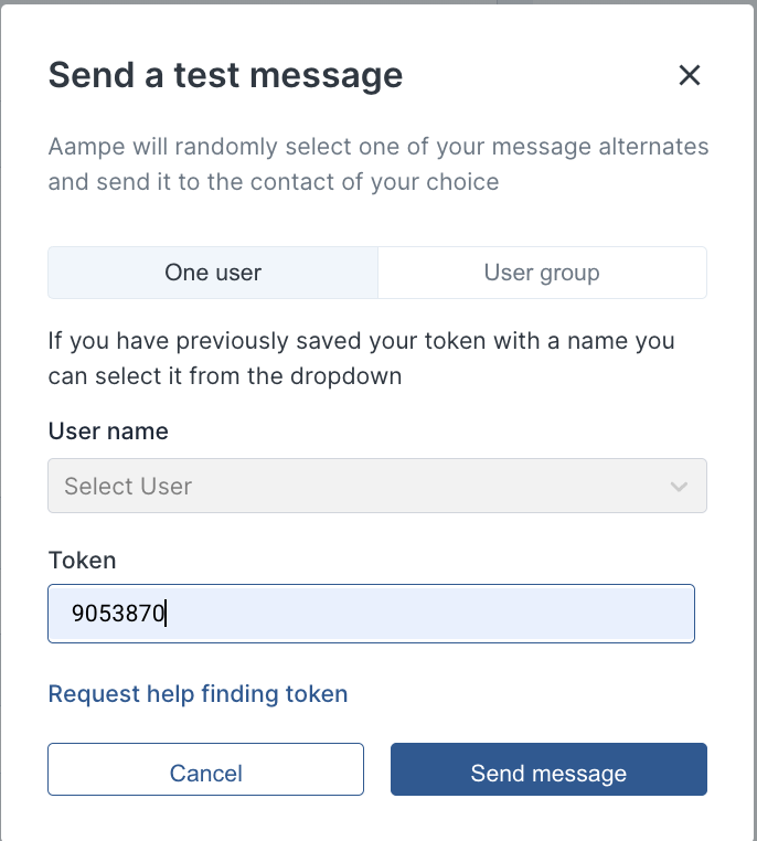 User Token and group token management can be done at https://compose.aampe.com/system-setup/account-members/test-message-setting
